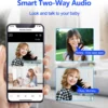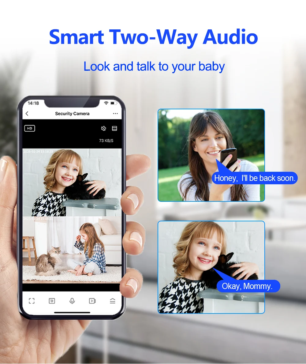 Compatible con intercomunicador bidireccional, puedes hablar y escuchar con la aplicación del teléfono. Aunque estés en otra ciudad o en otro país, podrás comunicarte con tu bebé en casa.