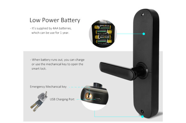 No es necesario llevar cableado ni alimentación eléctrica hasta la cerradura. Funciona con 4 pilas AA, que garantizan más de un año de funcionamiento.