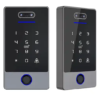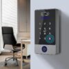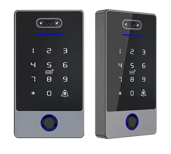 Controlador de acceso resistente a la intemperie con reconocimiento facial (FACE-ID) y lector de huella dactilar, diseñado para el control de cerraduras eléctricas, portones y barreras.