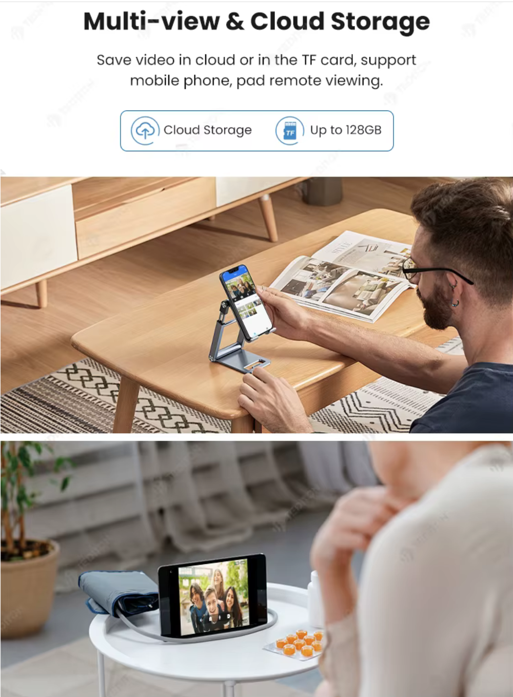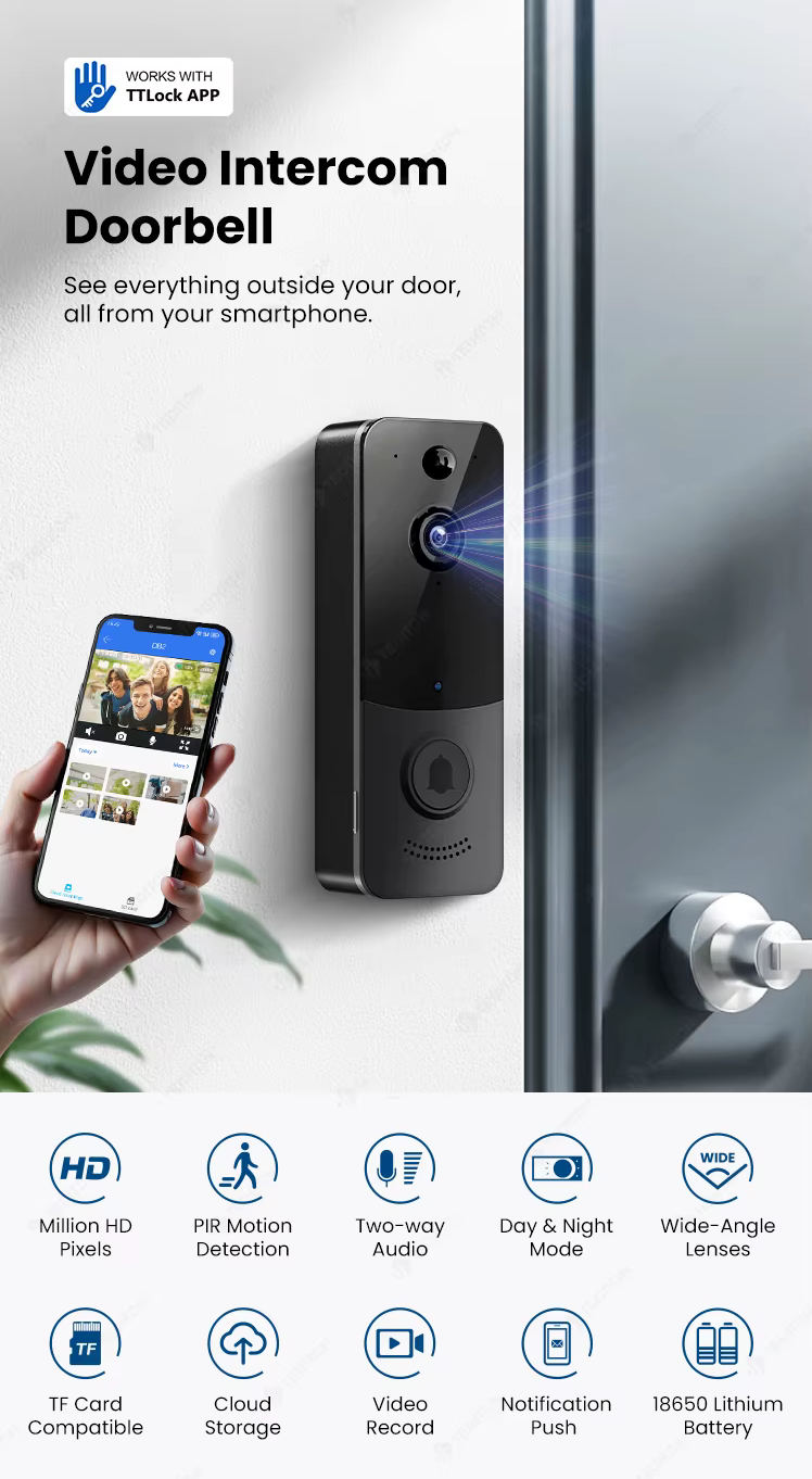 Timbre inalámbrico con cámara integrada de alta resolución y función de intercomunicador. Permite ver y comunicarse con los visitantes directamente desde el smartphone mediante la aplicación TTLOCK.
